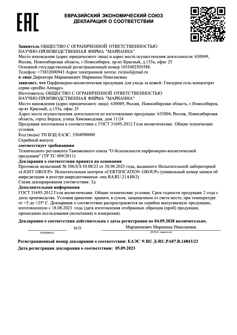 Состав: Вода; концентрат гиалуроната натрия 4 видов: кроссполимер, ацетилированный, низкомолекулярный, гидролизованный; пантенол; гидрованс; бисаболол; ксантан; карбомер; фенилэтанол; этилгексилглицерин; композиция эфирных масел; аминокислоты: лизин, таурин, аргинин.